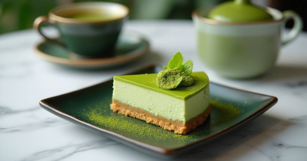 Manis, pahit dikit tapi bikin nambah terus. Matcha cheese cake merupakan perpaduan krim keju yang lembut (Creamcheese) dengan bubuk teh hijau matcha yang memberikan rasa khas, creamy dan warna hijau yang intens. Warna hijau lembut khas matcha yang dipadu dengan layar putih creamy di tengahnya, ditaburi bubuk matcha diatasnya, simple tapi bisa menuhi mood manis kamu. Begitu dipotong, teksturnya kelihatan padat, super lembut, dan langsung meleleh sebelum masuk ke mulut. Cream cheese yang lembut dan manis, dipadu dengan matcha yang sedikit pahit, rasanya jadi lebih berkelas dan nggak enek kayak cake lain.